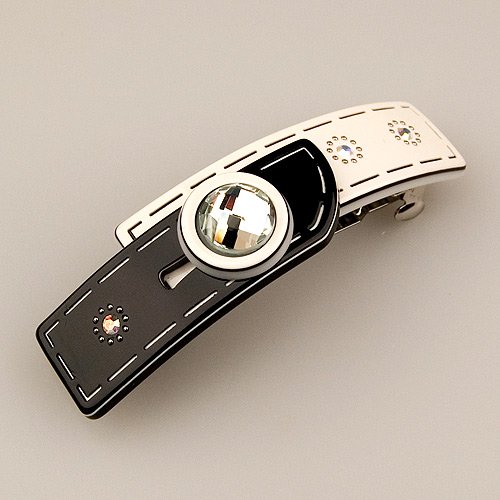 Cleverly designed, the black layer looks as if it is attached to the bottom white layer with a round, clear crystal button. Additional Swarovski Crystals, tiny silver studs and faux edge stitching add detail within the details. On the underside, a medium-sized French clip fastens securely to keep every hair in place.