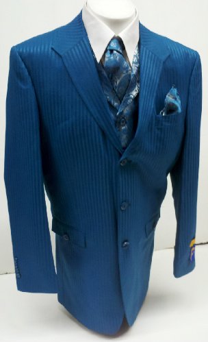 This is a brand new (factory hanger packed) three button single breasted dress suit package. It includes a jacket, vest, pants, tie, and handkerchief. The suit is constructed from high quality 100% poly. The jacket has three inside pockets, three outside pockets, and is fully lined. The pleated pants are a standard six inch drop, meaning if you order a size 46 suit it will come with 40 pants. This package will make sure you look great from head to toe!