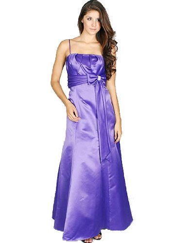 A dreamy satin finish covers the solid color material of this floor length formal dress. Its lightly padded bodice, detailed with skinny spaghetti straps, sits above a pleated empire waistline adorned with a rhinestone center bow. Finished with a zipper closure at the center back. Comes with a matching shawl. Length of Small formal dress from underarm: 50 inches. 100% Polyester. Professional Dry Clean only. Made in USA.